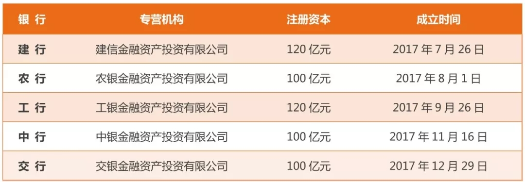 在《指導意見》指導下,2017年8月,首家金融資產投資公司——建設銀行全資子公司建信金融資產投資公司開業。目前,我國已成立五家分別由工、農、中、交、建五大商業銀行設立的金融資產投資公司: