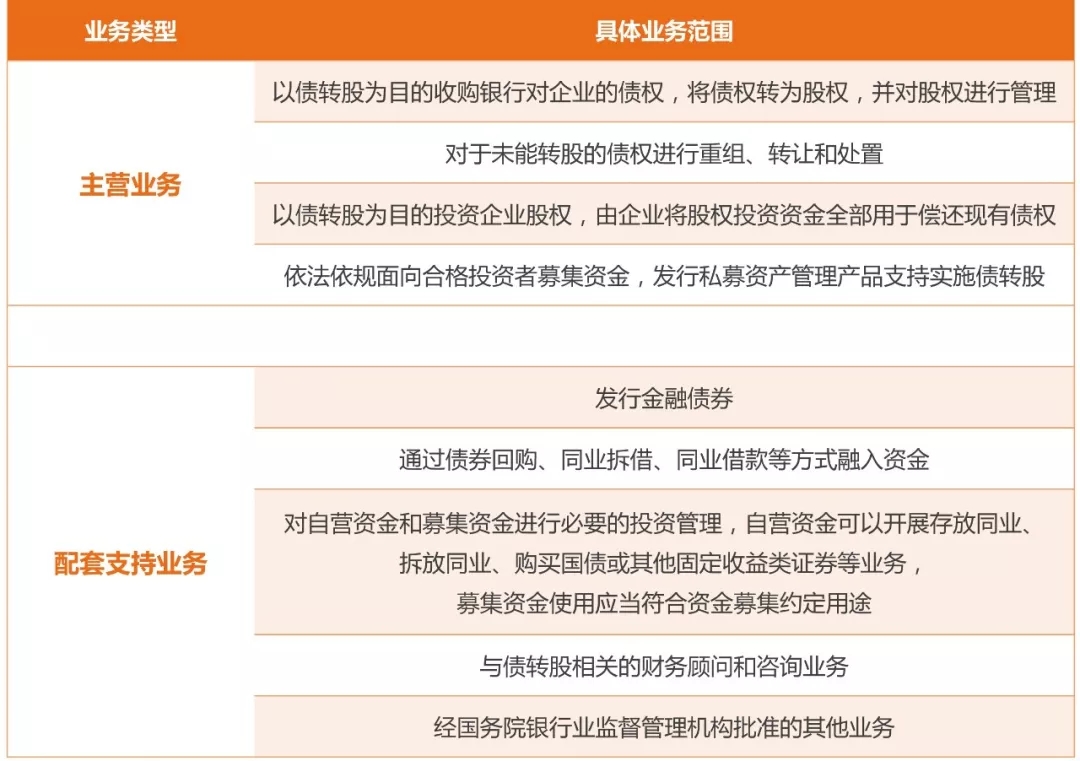 《辦法》第二十三條規定:經國務院銀行業監督管理機構批準,金融資產投資公司可以經營下列部分或者全部業務: