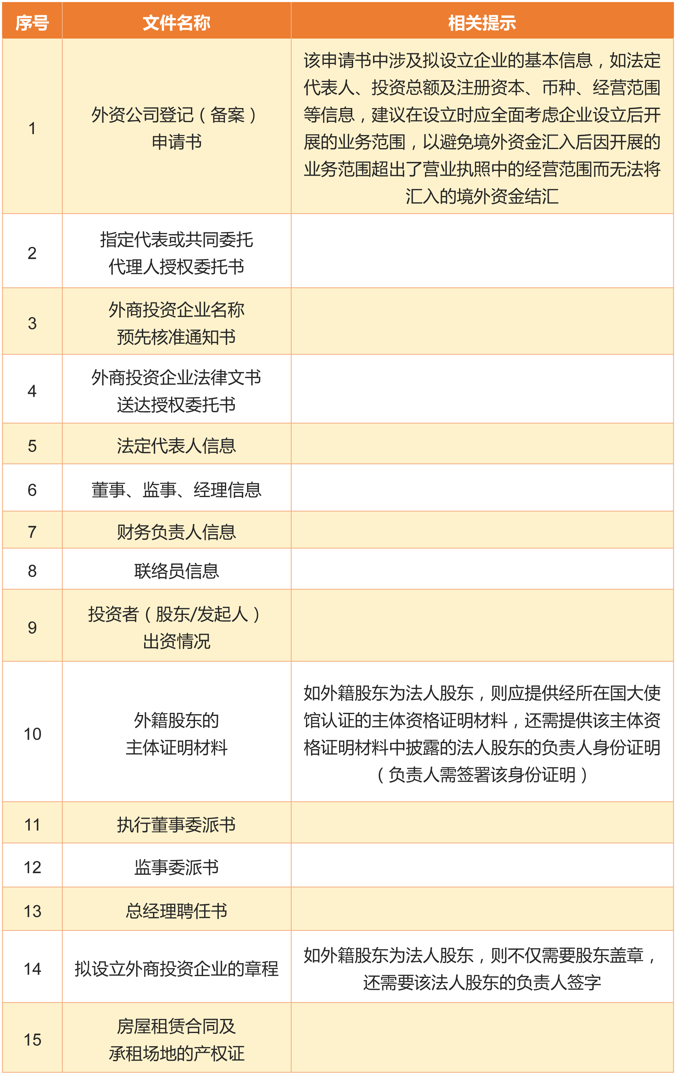 外國(guó)企業(yè)啟動(dòng)在中國(guó)境內(nèi)設(shè)立外商投資企業(yè)的程序,應(yīng)首先通過(guò)擬設(shè)立外商投資企業(yè)所在地的工商局進(jìn)行工商登記程序。因各地工商局對(duì)于外商投資企業(yè)的設(shè)立程序所涉及到的表格填寫及辦理時(shí)間長(zhǎng)度有差異,故建議在啟動(dòng)設(shè)立程序之前,應(yīng)前往當(dāng)?shù)毓ど叹秩媪私馑杼顚懙奈臅愋图澳0濉r(shí)間長(zhǎng)度以及需要提交的支撐文件。下面,以筆者所承辦的一個(gè)案件為例,列明設(shè)立外商投資企業(yè)程序中應(yīng)提交的文件明細(xì),僅供參考: