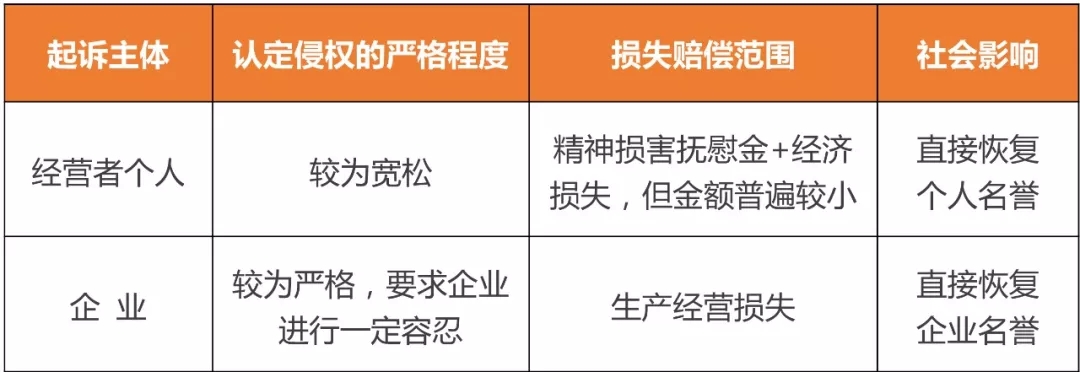 如果侵權(quán)行為無法滿足商業(yè)詆毀的要件,則只能以名譽權(quán)侵權(quán)為由提起訴訟。由于個人和企業(yè)均可能是被侵害的主體,首先面臨如何選擇起訴主體的問題。以個人名義起訴和企業(yè)名義起訴對維權(quán)有以下不同影響: