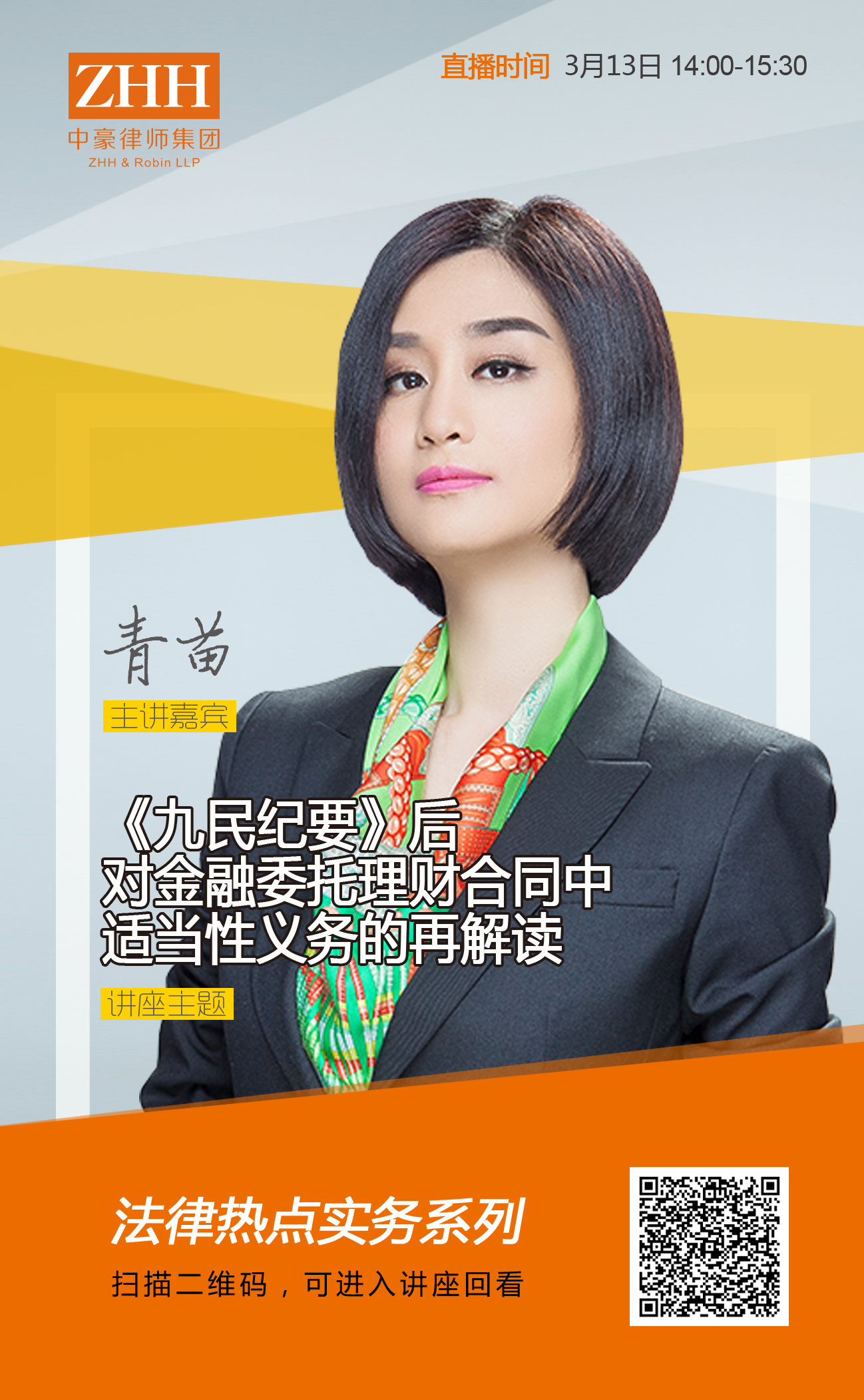 掃描海報中二維碼,可進(jìn)入“《九民紀(jì)要》后對金融委托理財合同中適當(dāng)性義務(wù)的再解讀”講座回看。