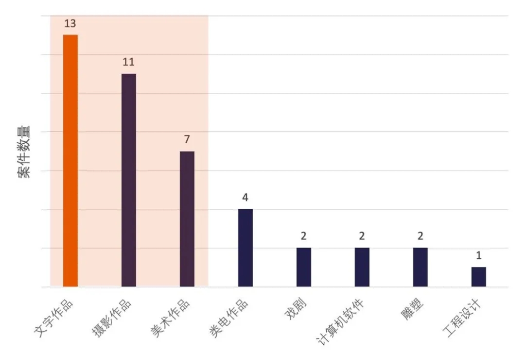 上圖顯示,文字作品和攝影作品發生糾紛的數量較多,其后是美術作品。