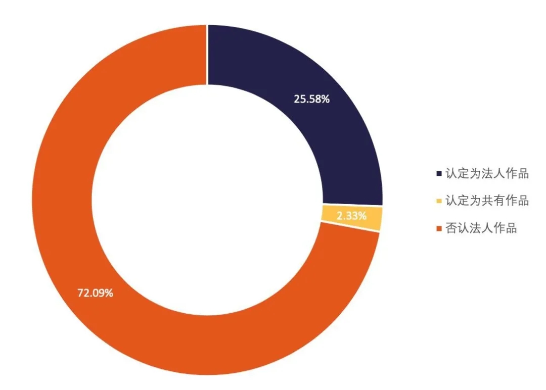 42件案例中,共有11件法院認定案涉作品系“法人作品”,有1件認定為共有作品。可見法院支持的法人作品占少數。