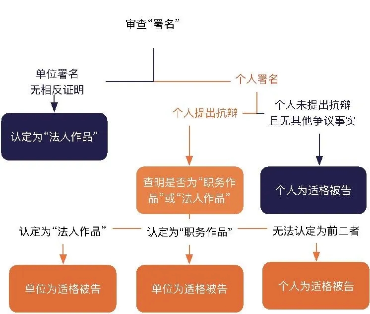 如果署名為個人,作為被告的個人可對作品的歸屬提出異議。通常情況下,如果有相關事實或證據表明署名并非一定為作者時,法院也會進行主動審查。個人可從作品屬于“法人作品”,或者創作系職務行為兩個思路進行抗辯。法院根據抗辯主張進行審查,既有判決主要存在以下3類情況: