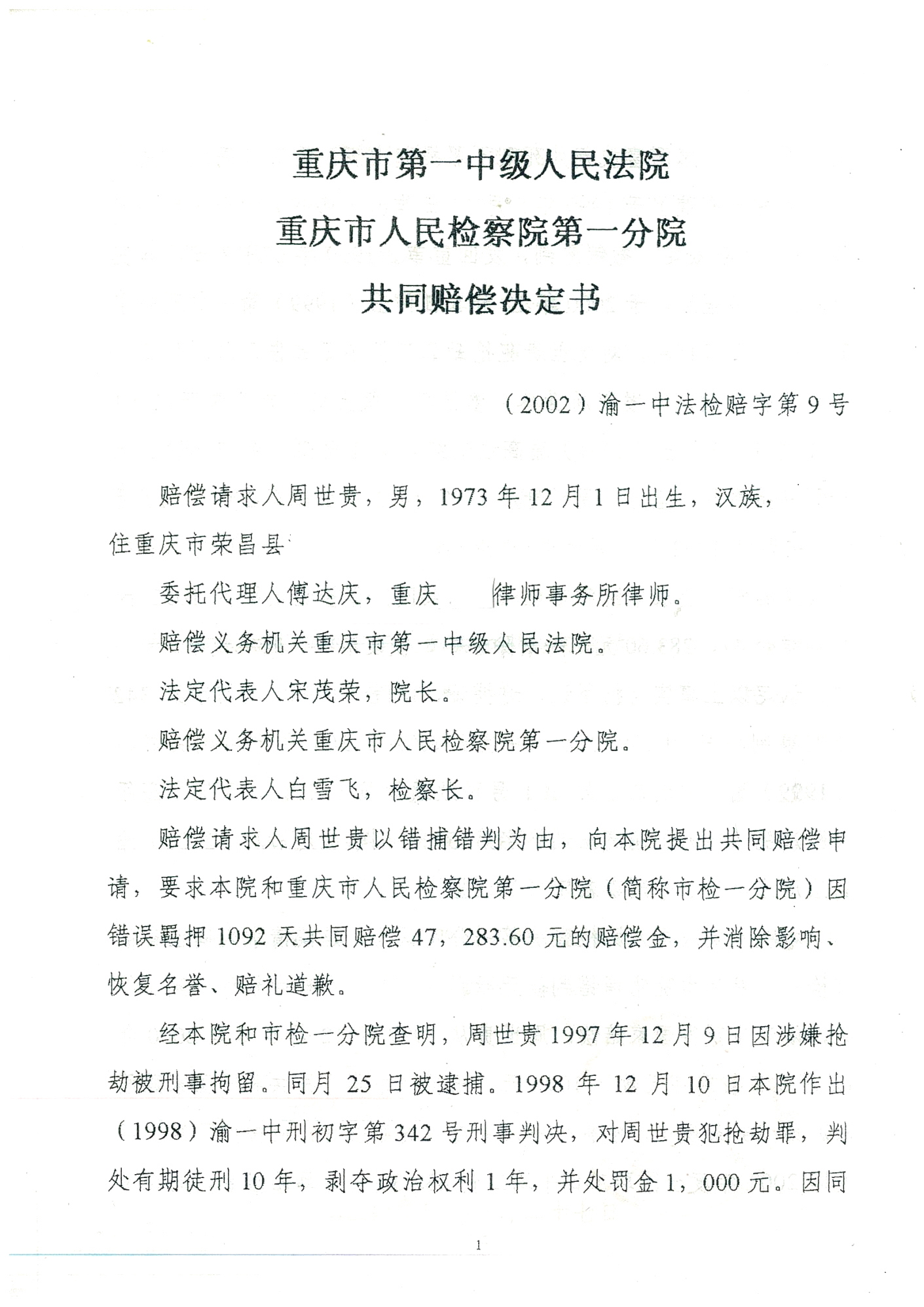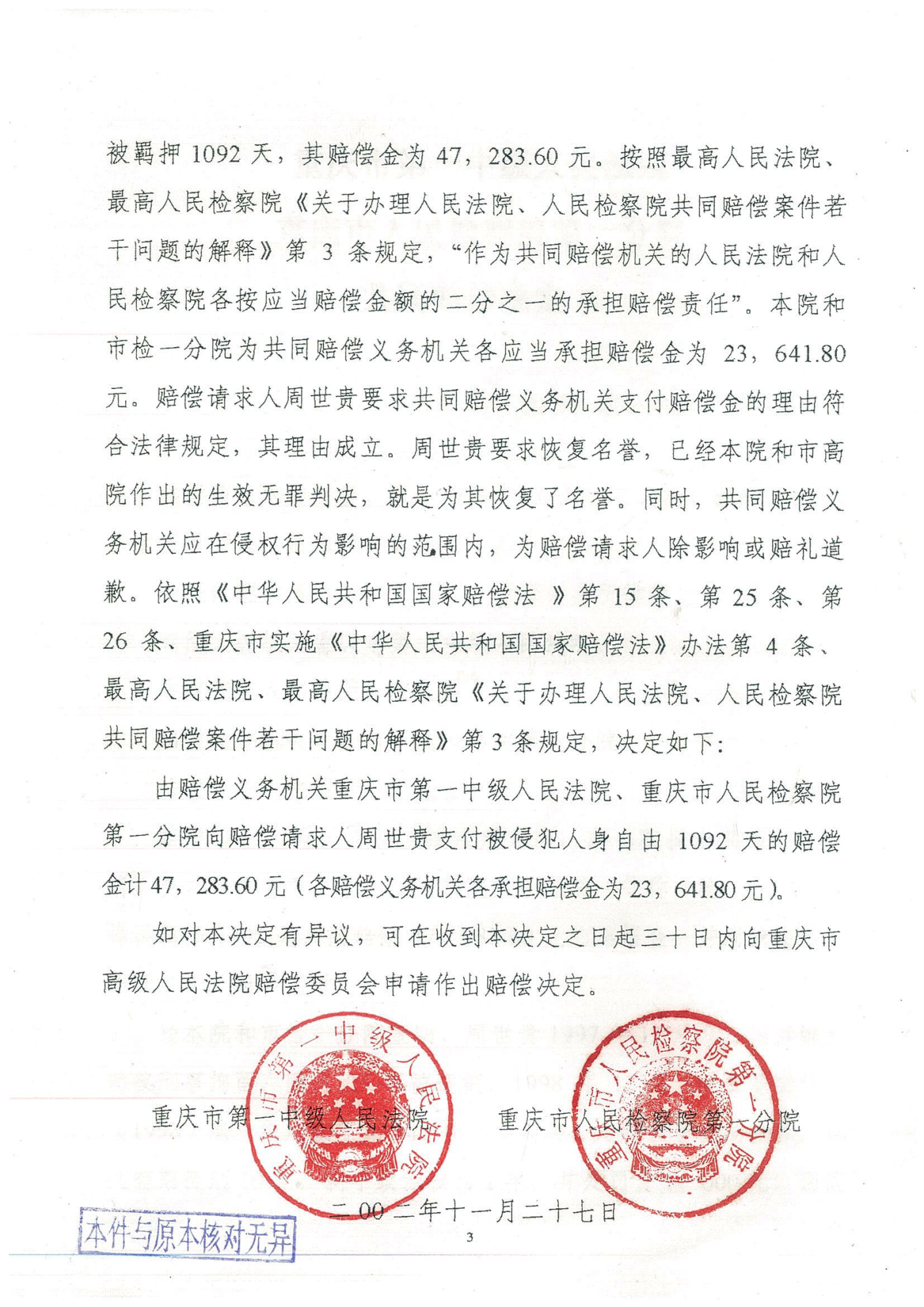 洗清冤屈的周世貴雖然回到了社會,但已經一無所有。他被捕后,磚廠物資被工人和村民一搶而空。為打官司,其妻子將家產變賣,受此打擊,整天神情恍惚,無心打理生意。他們的女兒生下來就沒看見父親,只是在三次開庭時才遠遠看見父親的背影,三歲多了還不知道父親是啥模樣。出于對他們一家的同情,我建議周世貴申請國家賠償,并為他提供法律援助。經過一番工作,2002年11月27日,重慶一中院和重慶檢察一分院作出(2002)渝一中法檢賠字第9號共同賠償決定:賠償周世貴因被侵犯人身自由1093天的賠償金47283.60元(各賠償義務機關各承擔賠償金23641.80元)。此項賠償,創下了《國家賠償法》自1995年1月1日實施以來,重慶市個人獲得國家賠償的最高紀錄。遺憾的是當時國家賠償尚未有精神損害賠償的規定。至此,我的工作圓滿結束。