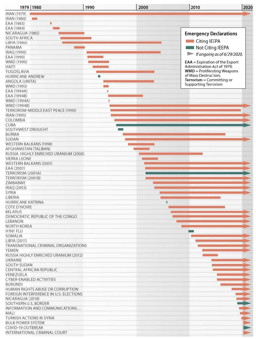 縱觀整個(gè)20世紀(jì),美國(guó)意識(shí)到三權(quán)分立體制相對(duì)較低的決策效率,為了應(yīng)對(duì)復(fù)雜的國(guó)際局勢(shì),國(guó)會(huì)通過(guò)立法的方式授予總統(tǒng)越來(lái)越廣泛的行政緊急權(quán),使總統(tǒng)可以不必經(jīng)過(guò)國(guó)會(huì)宣布國(guó)家緊急狀態(tài),進(jìn)而采取激進(jìn)的行政措施以應(yīng)對(duì)所謂的緊急狀態(tài)??偨y(tǒng)令從1917年頒布的《與敵貿(mào)易法》開(kāi)始逐漸合法化,國(guó)會(huì)授予總統(tǒng)在戰(zhàn)時(shí)有監(jiān)督、限制和調(diào)整與敵國(guó)的所有貿(mào)易關(guān)系。1933年,為了應(yīng)對(duì)大蕭條頒布的《銀行緊急救濟(jì)法案》,賦予總統(tǒng)羅斯福暫停銀行運(yùn)作等整頓經(jīng)濟(jì)的權(quán)利。二戰(zhàn)和冷戰(zhàn)時(shí)期,《與敵貿(mào)易法》得到了廣泛的運(yùn)用。到了20世紀(jì)70年代中期,隨著美國(guó)卷入越戰(zhàn)、暗殺外國(guó)政要、非法國(guó)內(nèi)監(jiān)聽(tīng)和水門(mén)事件等濫用行政權(quán)力事件被公諸于眾,美國(guó)國(guó)會(huì)在1976和1978年頒布了《國(guó)家緊急狀態(tài)法》和《國(guó)際緊急狀態(tài)經(jīng)濟(jì)權(quán)力法》。這兩部法律是對(duì)總統(tǒng)權(quán)力進(jìn)行限制,明確僅在應(yīng)對(duì)源于美國(guó)境外威脅的情況下,美國(guó)總統(tǒng)才有權(quán)宣布緊急狀態(tài)?!秶?guó)際緊急狀態(tài)經(jīng)濟(jì)權(quán)利法》還設(shè)置了前提條件,例如總統(tǒng)需要說(shuō)明國(guó)家安全、外交政策或者國(guó)家經(jīng)濟(jì)正在遭受來(lái)自海外的“不尋常且極其嚴(yán)重的威脅”。盡管如此,歷屆總統(tǒng)還是以上述兩部法律為授權(quán)宣布緊急狀態(tài),截至2020年7月1日,美國(guó)總統(tǒng)援引《國(guó)際緊急狀態(tài)經(jīng)濟(jì)權(quán)力法》宣布的國(guó)家緊急狀態(tài)達(dá)59次,其中33個(gè)命令仍然有效。這些緊急狀態(tài)通常延續(xù)十年左右,而歷史最為悠久的因伊朗人質(zhì)危機(jī)而起的國(guó)家緊急狀態(tài)即將進(jìn)入第50個(gè)年頭。