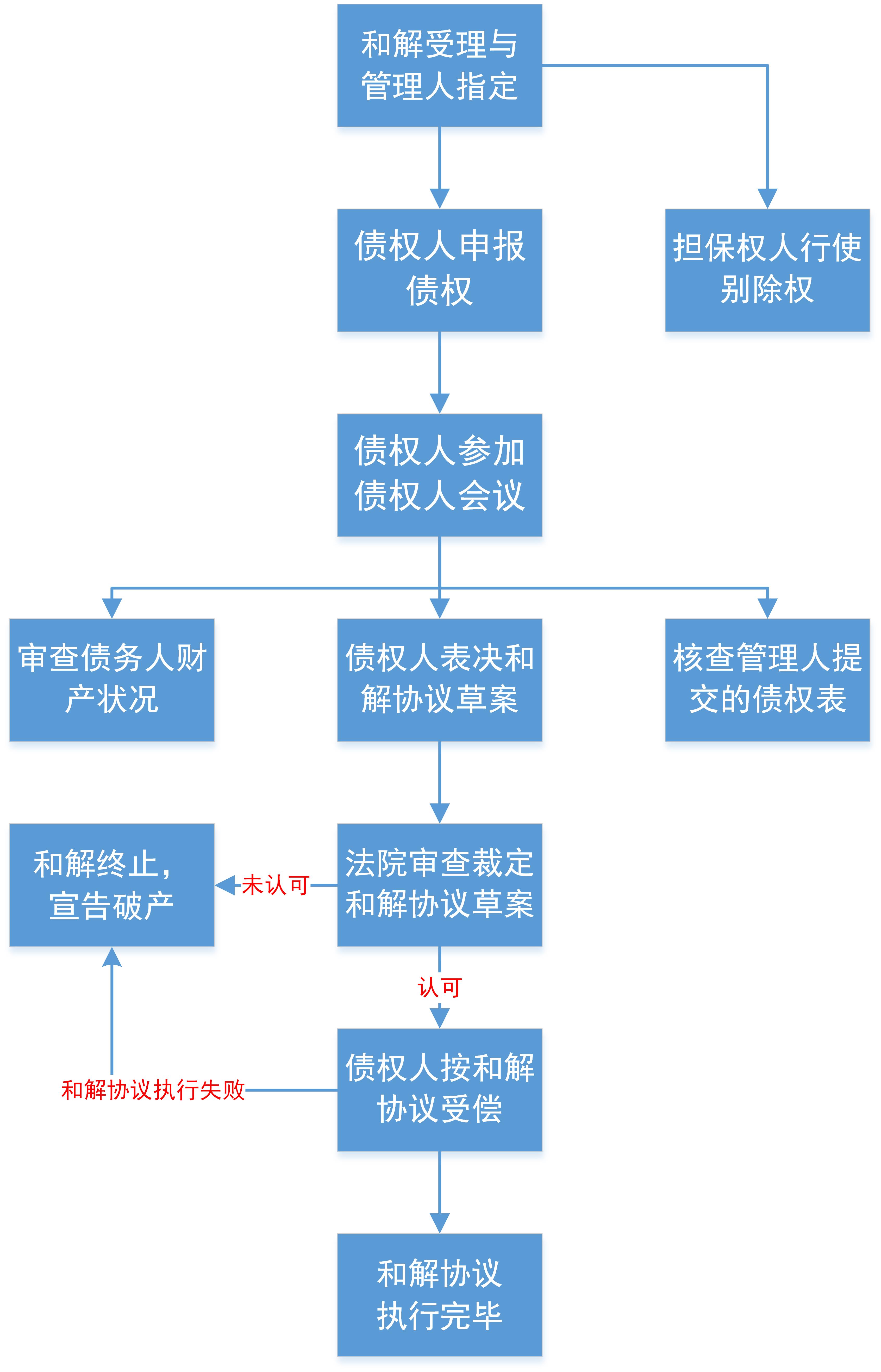 和解,是指經發生破產原因的債務人申請,在法院主持下由其和債權人進行協商,就債務償還事項制訂和解協議草案,經債權人會議表決通過及法院裁定認可后生效,由債務人按和解協議執行,避免債務人破產的法律程序。債權人參與的基本流程如下: