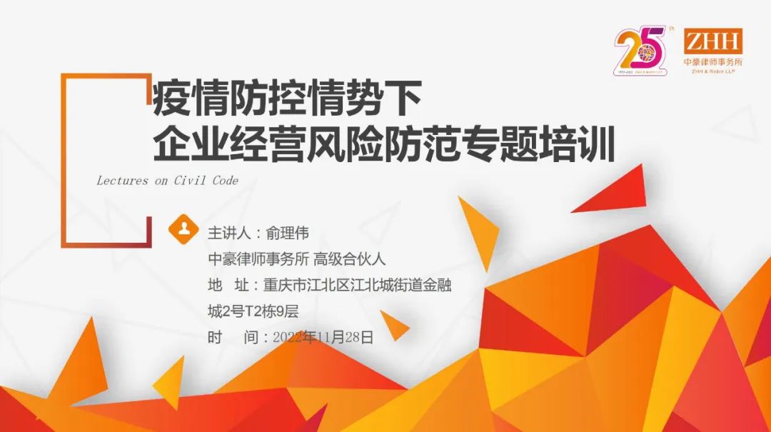 立冬初始,疫情之下的重慶略顯安靜,但重慶人的團結可以溫暖這個初冬。為企業在疫情期間可能遇到的典型經營風險提供專業建議,中豪及時舉辦一系列線上公益法律講座,為企業排憂解難,助力企業克服當下危機。2022年11月28日下午,合伙人俞理偉為重慶市青年企業家協會和重慶市青年商會舉辦“疫情防控情勢下企業經營法律風險防范”騰訊線上專題培訓,諸多青年企業家及企業管理者參與本次培訓并給予好評。