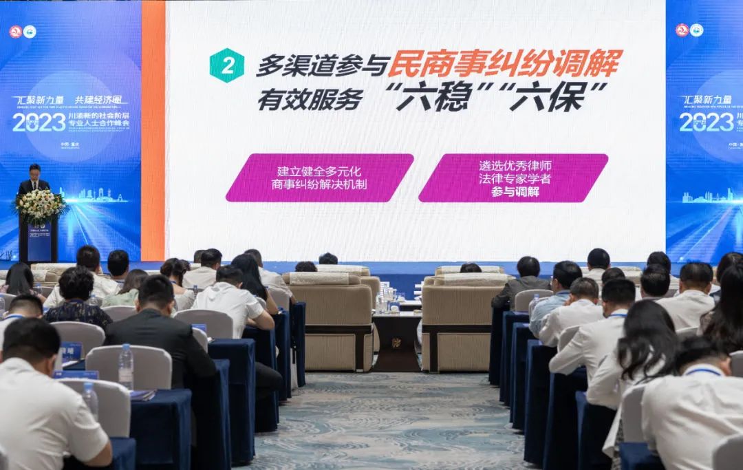 2023年6月29日,由重慶市委統戰部、四川省委統戰部聯合主辦的2023川渝新的社會階層專業人士合作峰會在渝開幕,共有來自全國及川渝地區的千余名專家學者和專業人士參加。重慶市委常委、統戰部部長盧紅,四川省委常委、統戰部部長趙俊民出席開幕式并致辭。管委會主席袁小彬應邀出席峰會,并發表“充分發揮律師專業優勢,助力優化成渝雙城經濟圈法治化營商環境”主旨演講。