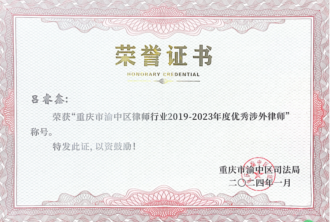 2024年1月24日下午,渝中區律師工作委員會換屆選舉大會暨律師行業表彰大會在渝中區政府金馬會議中心召開,大會舉行了“2019-2023年度優秀律師”頒獎儀式,合伙人呂睿鑫榮獲2019-2023年度優秀涉外律師大獎。