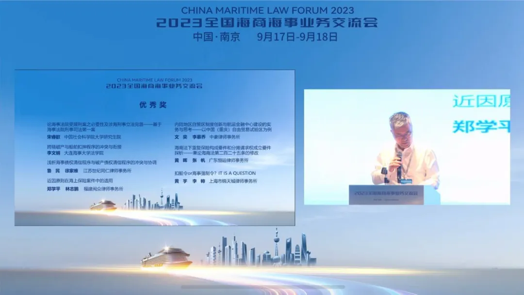 9月17至18日,由全國(guó)律協(xié)海商海事專業(yè)委員會(huì)、中國(guó)海商法協(xié)會(huì)、江蘇省律師協(xié)會(huì)主辦的2023年全國(guó)海商海事業(yè)務(wù)交流會(huì)在南京召開。合伙人文奕與李慕喬律師所撰《內(nèi)陸地區(qū)自貿(mào)區(qū)制度創(chuàng)新與航運(yùn)金融中心建設(shè)的實(shí)務(wù)與思考——以中國(guó)(重慶)自由貿(mào)易試驗(yàn)區(qū)為例》一文榮獲全國(guó)海商海事業(yè)務(wù)交流會(huì)優(yōu)秀論文獎(jiǎng),并入選2023全國(guó)海商海事業(yè)務(wù)交流會(huì)論文集。文律師作為全國(guó)律協(xié)海商海事專業(yè)委員會(huì)委員出席交流會(huì)并參加頒獎(jiǎng)儀式。