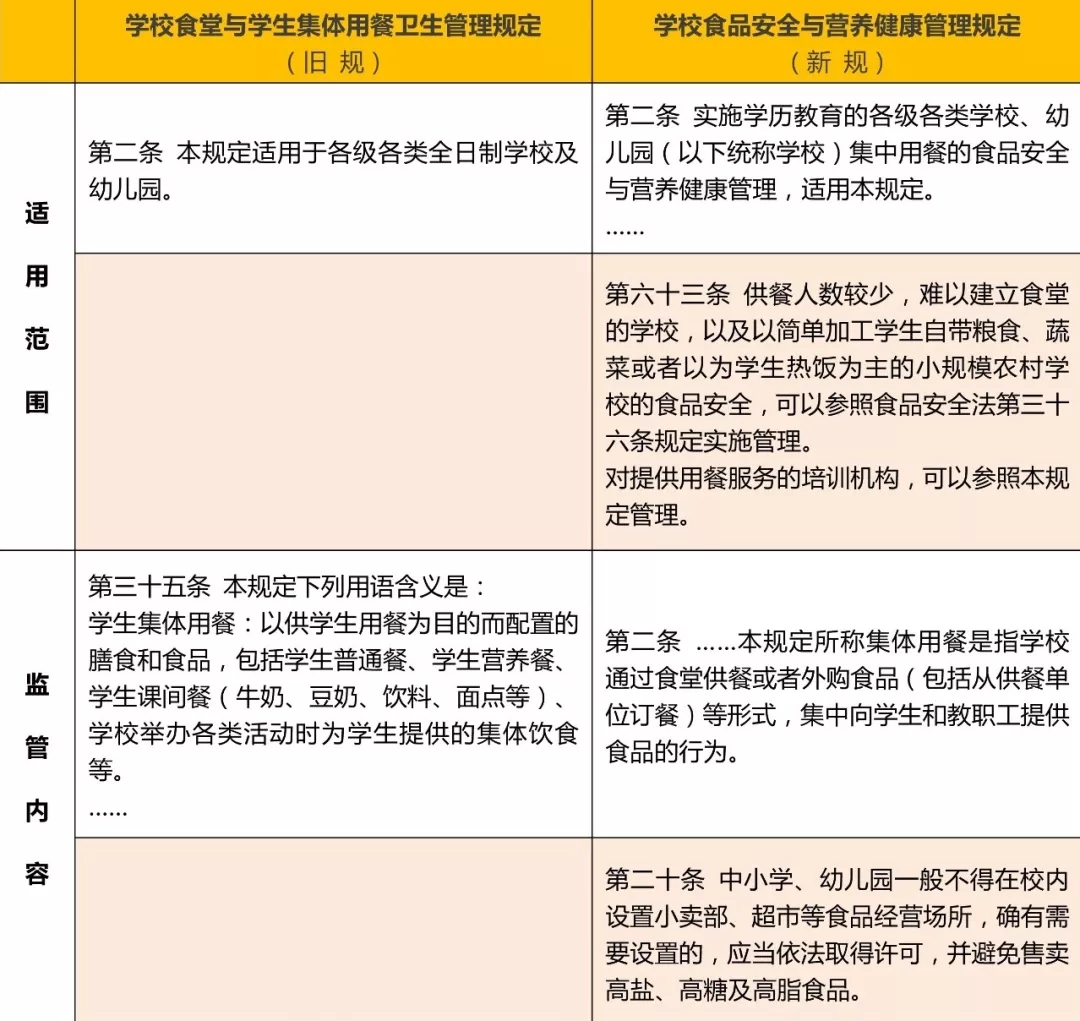 如上表所示,相比舊規(guī),新規(guī)首先明確了新規(guī)適用的范圍是“實施學(xué)歷教育的各級各類學(xué)校、幼兒園(以下統(tǒng)稱學(xué)校)集中用餐的食品安全與營養(yǎng)健康管理”,相比于舊規(guī)的“各級各類全日制學(xué)校以及幼兒園”而言,更加明確了新規(guī)適用于所有的實施學(xué)歷教育的學(xué)校和幼兒園,無論是全日制或非全日制。