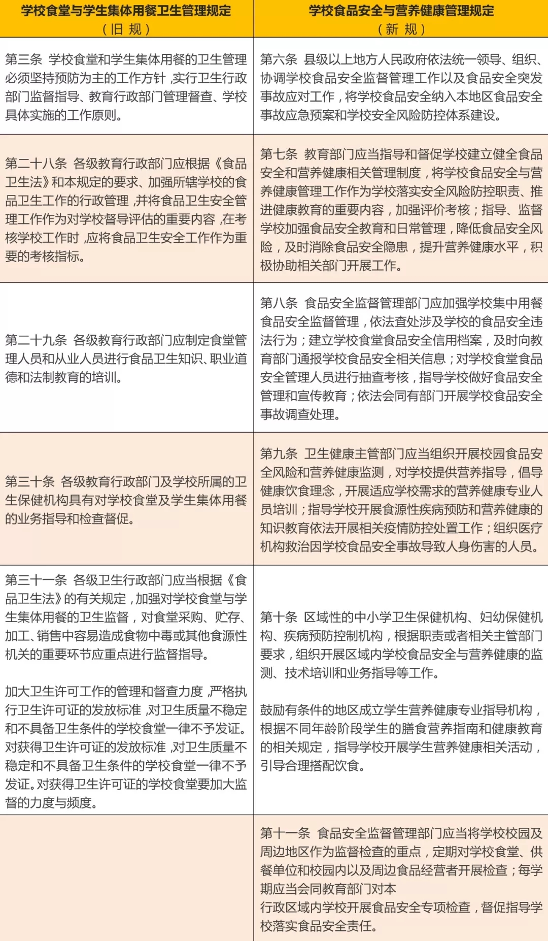 新規(guī)與舊規(guī)相比,新規(guī)并非簡單在舊規(guī)上的修補,而是從行政機(jī)關(guān)監(jiān)管職責(zé)、學(xué)校職責(zé)、食堂和外購食品分類管理和預(yù)后措施對舊規(guī)進(jìn)行了重新架構(gòu)。從整體上刪減了舊規(guī)中關(guān)于食堂和食品采購的一些形式要求,例如食堂的建筑要求、細(xì)節(jié)環(huán)境要求和貯藏等細(xì)節(jié)要求,而更加強調(diào)學(xué)校食品管理工作的“安全底線”,更加重視日常管理和安全事件應(yīng)急處理。