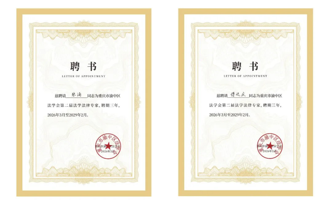 未來,兩位律師將切實履行法學法律專家職責,積極參與渝中區法學研究、決策咨詢、法治實踐等工作,貢獻中豪律師的專業力量。中豪也將持續踐行社會責任,以優質法律服務助力區域經濟社會高質量發展,為法治重慶建設添磚加瓦。
